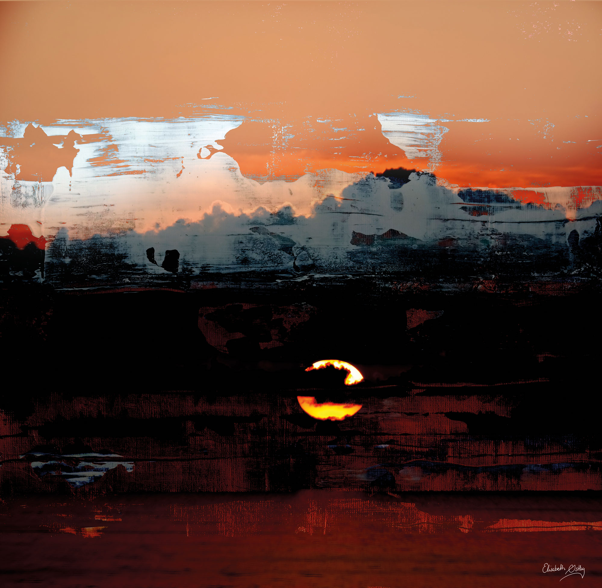 Fotografiet av solnedgangen er montert digitalt med akrylmaleri. Fargene forsterker inntrykket av mørke og lys på samme tid. Mørket sluker lyset.