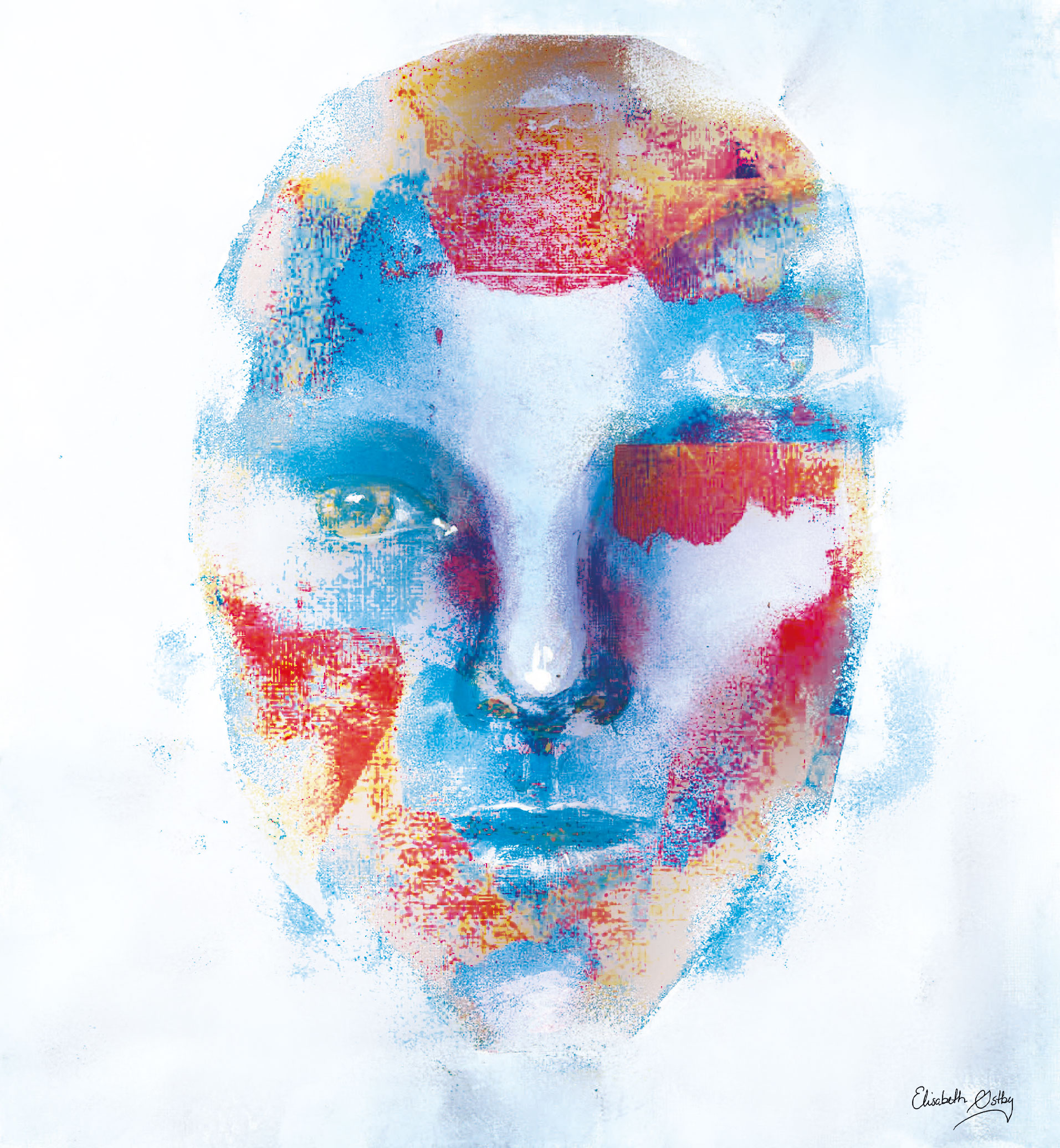 Sjelens vindu er øynene. Fargene i akrylmaleriet er redigert digitalt og skaper et kontrastfyllt uttrykk fra det kalde blå, til det varme røde. Ett øye som ikke ser, men som oppfatter alt likevel.