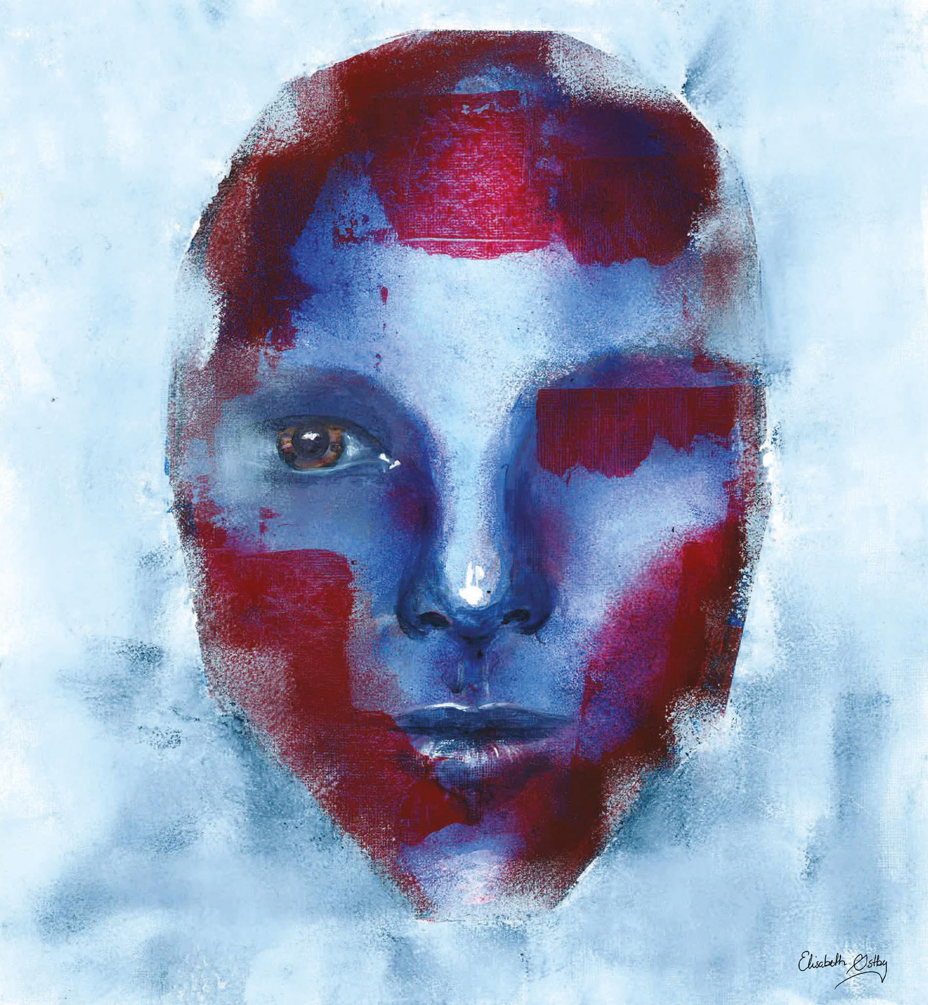 Akryl på papir. Et bilde i en serie på tre. Dette bildet viser tre av våre viktigste sanser; syn, lukt og smak.