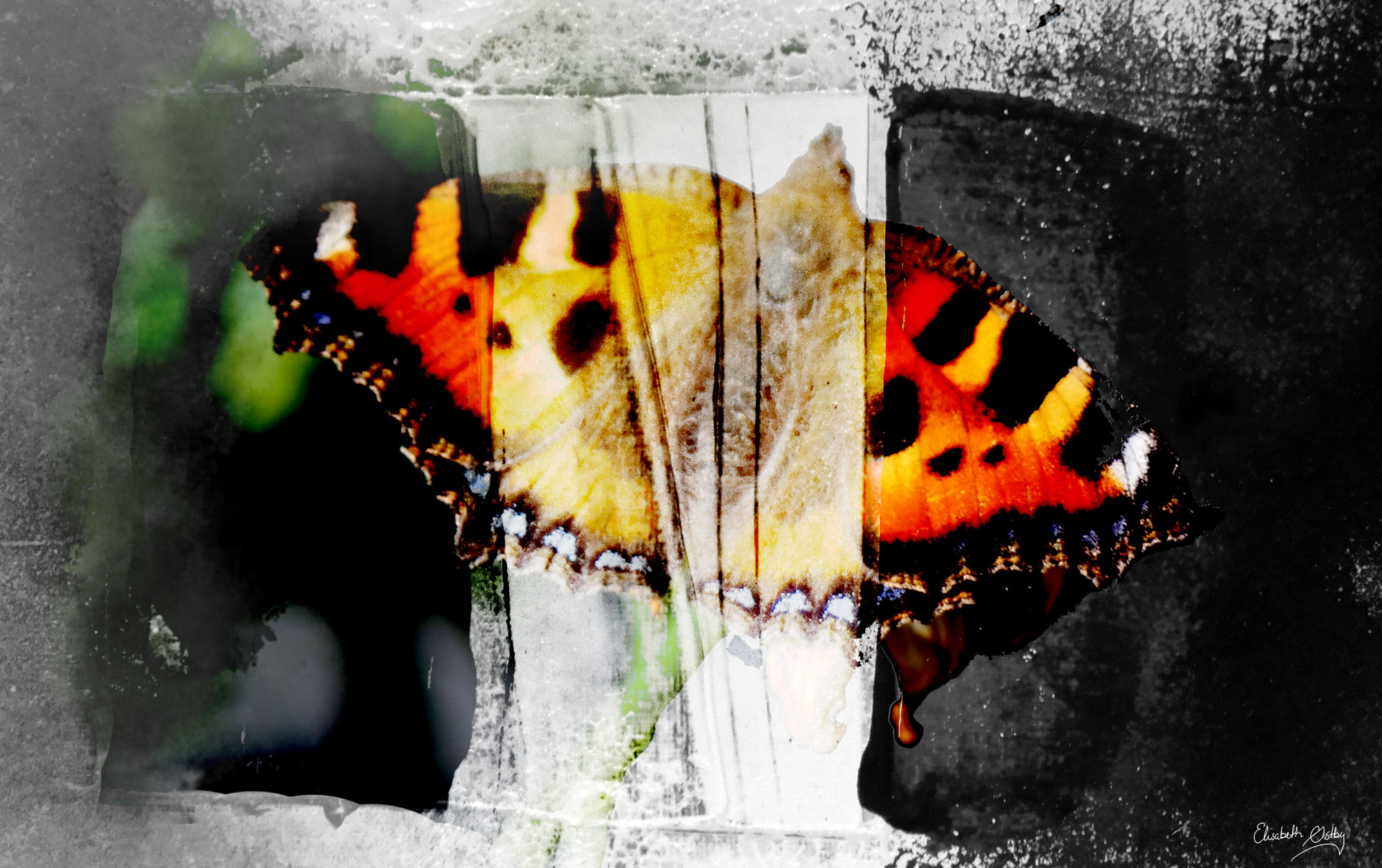 Det kan bli dramatisk når fotografi møter maleri. Den varme sommerfuglen står i sterk kontrast til de kalde fargene i maleriet, og sammen med teksturen av malingen skapes et dramatisk uttrykk der assosiasjoner til et skjørt liv kommer tydelig fram.
